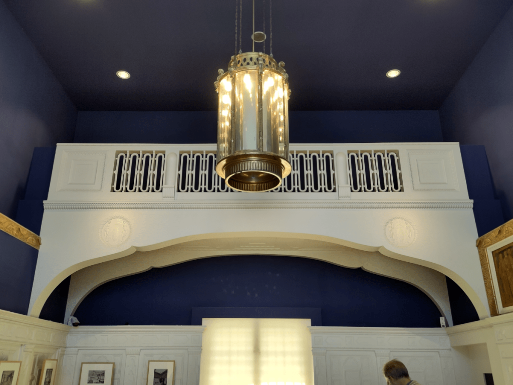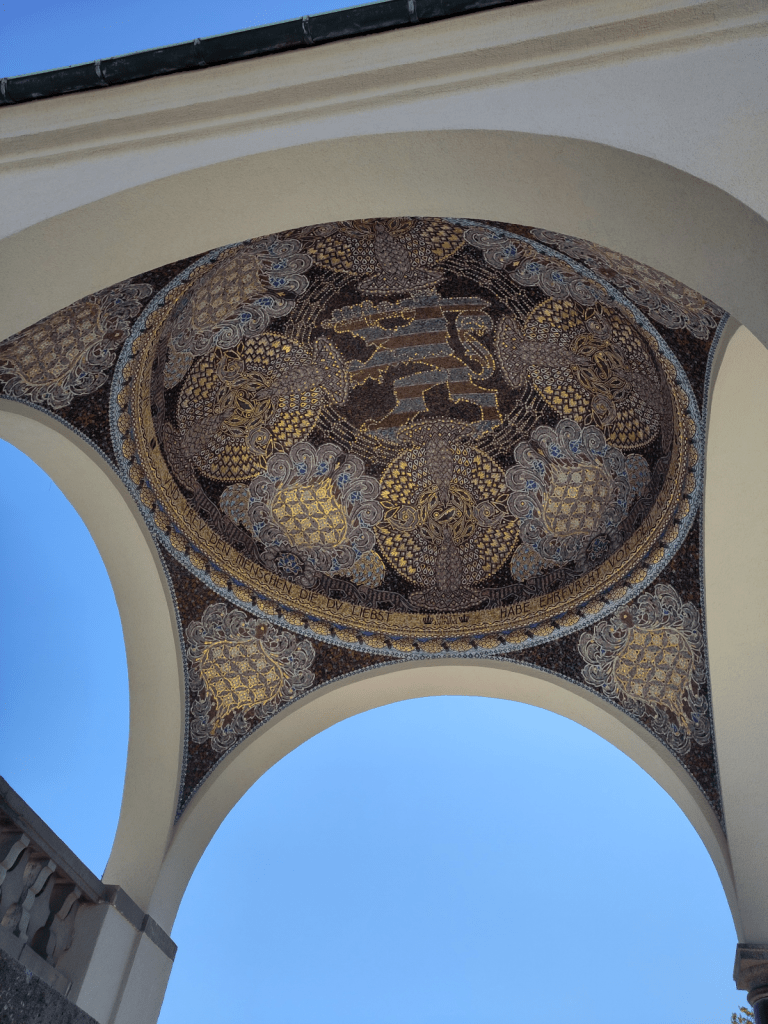 Schönes Detail schon beim Aufgang: Ein reich geschmückter Mosaik-Baldachin überspannt den ersten Treppenabsatz.