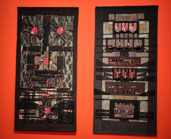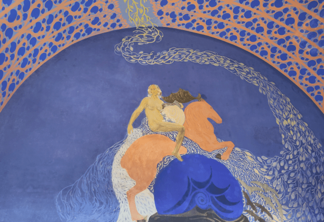 Natürlich gibt es auch einige Ausstellungen auf der Mathildenhöhe. Im Ausstellungsgebäude wird bis zum 25. April eine Zeitreise durch 200 Jahre Kunstgeschichte in Darmstadt gezeigt. Besonders fasziniert haben mich zwei textile Wandbehänge, dramatisch in Szene gesetzt vor roten Wänden.