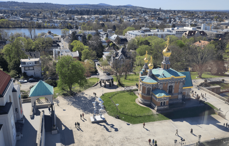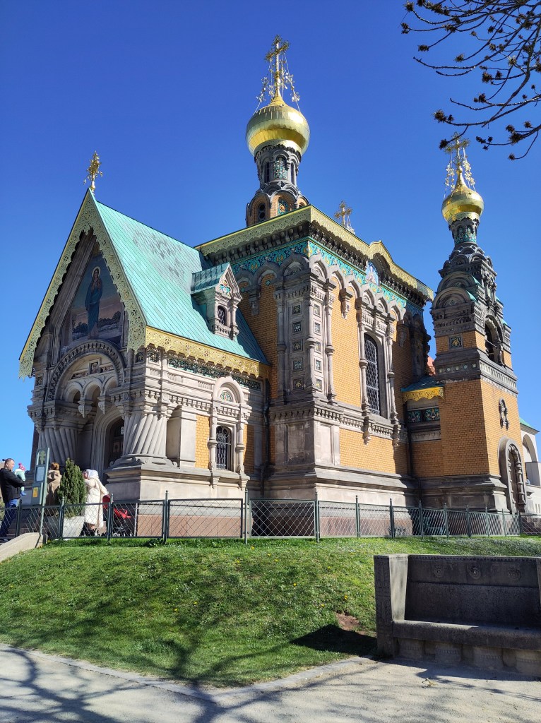 Auch für für den Bau der russischen Kapelle war eine Hochzeit der Grund und zwar eine wirklich hochkarätige: Die jüngste Schwester des Großherzogs Ernst Ludwig heiratete Nikolaus II., den letzten russischen Zaren. Das Paar errichtete die Kapelle, um bei ihren Besuchen der deutschen Verwandtschaft ihren Glauben in angemessener Umgebung praktizieren zu können. Und für das „angemessen“ trugen sie gründlich Sorge. Selbst die Erde, auf der sie steht, wurde eigens aus Russland nach Darmstadt gebracht. Es wurde auch ansonsten an nichts gespart – schließlich zahlte der Zar alle Kosten aus seinem Privatvermögen. So waren zahlreiche russische Künstler am Bau und der Ausstattung der Kirche beteiligt. Eigens von Villeroy und Boch gefertigte Kacheln, vergoldete Zwiebeltürme und reiche Ornamente zieren das Bauwerk.