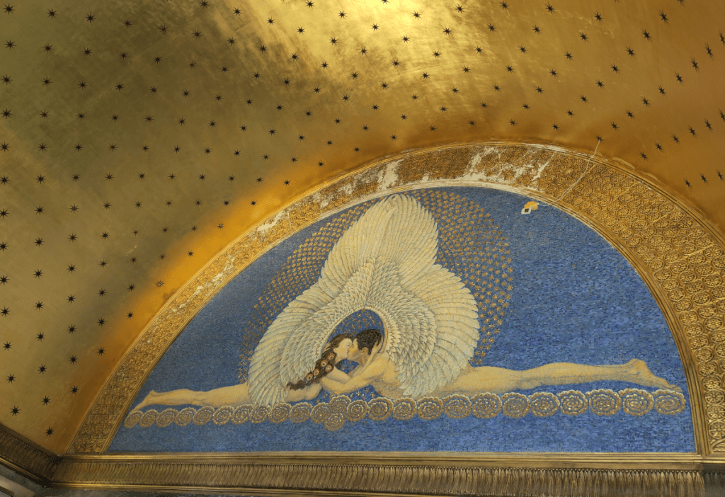 Schon der Eingangsbereich ist überwältigend mit seinen opulenten Deckenmosaiken. Natürlich dreht sich hier alles um das Thema Liebe. Ich hatte das Bedürfnis, mich eine Weile auf den Boden zu setzen, und nur diesen schönen Anblick aus blauem und goldenem Mosaik zu genießen. Damit wäre ich allerdings in dem kleinen Eingangsbereich zu einem ziemlichen Verkehrshindernis geworden…